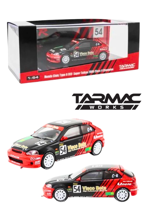 Celebrate JDM racing history with the Tarmac Works Honda Civic Type R EK9 Super Taikyu 2000 Class 4 Champion #54 in 1:64 scale (model code: T64-010-ADV).